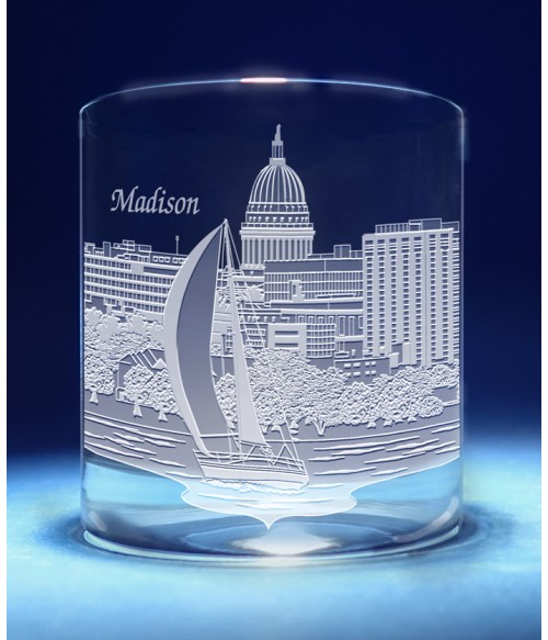 Madison, Wisconsin's skyline hand-engraved on your choice of barware.