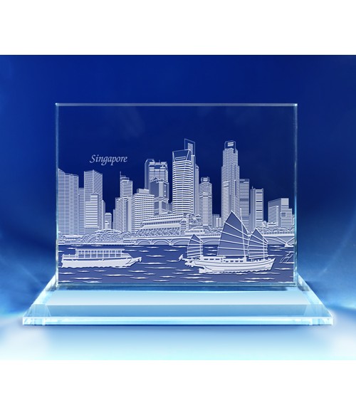 Singapore skyline hand-engraved on a 1/2" thick rectangle award and mounted to base.